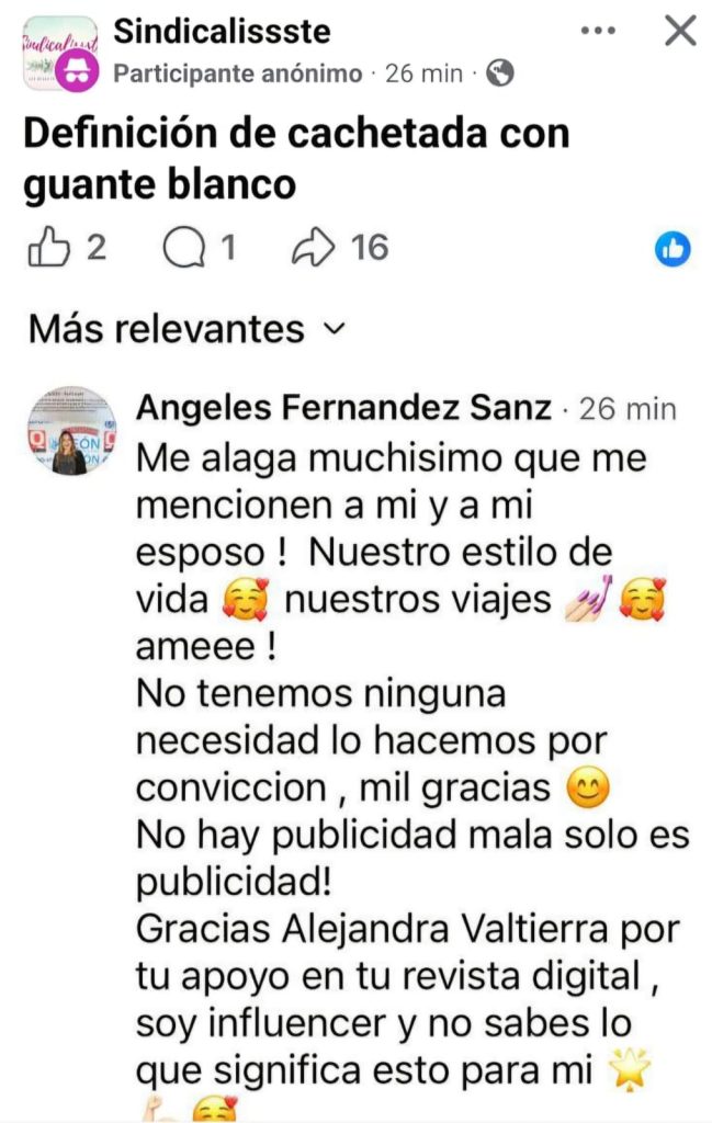 La señora Fernández Sanz -esposa del ortopedista Armando Pérez Solares, adscrito al Hospital Regional “Gral. Ignacio Zaragoza”, no es trabajadora del ISSSTE, como lo reconoció en el sitio “Sindicalissste” de Facebook.