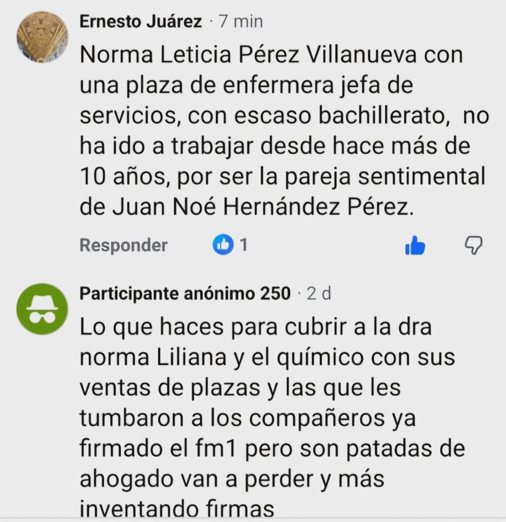 *¿Como justifican la corrupción del representante de la planilla blanca ante el comité nacional electoral, Juan Noé Hernández Pérez?¿Es verídica la información que su actual esposa, Norma Leticia Pérez Villanueva tiene la prerrogativa de no presentarse a su centro de trabajo desde hace diez años? Lo que es real es que durante la gestión de su marido en la sección III “Clínicas de Medicina Familiar”, gozó de comisión sindical y se le escalafonó.