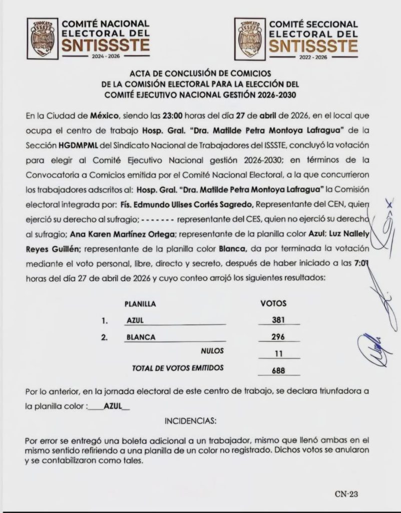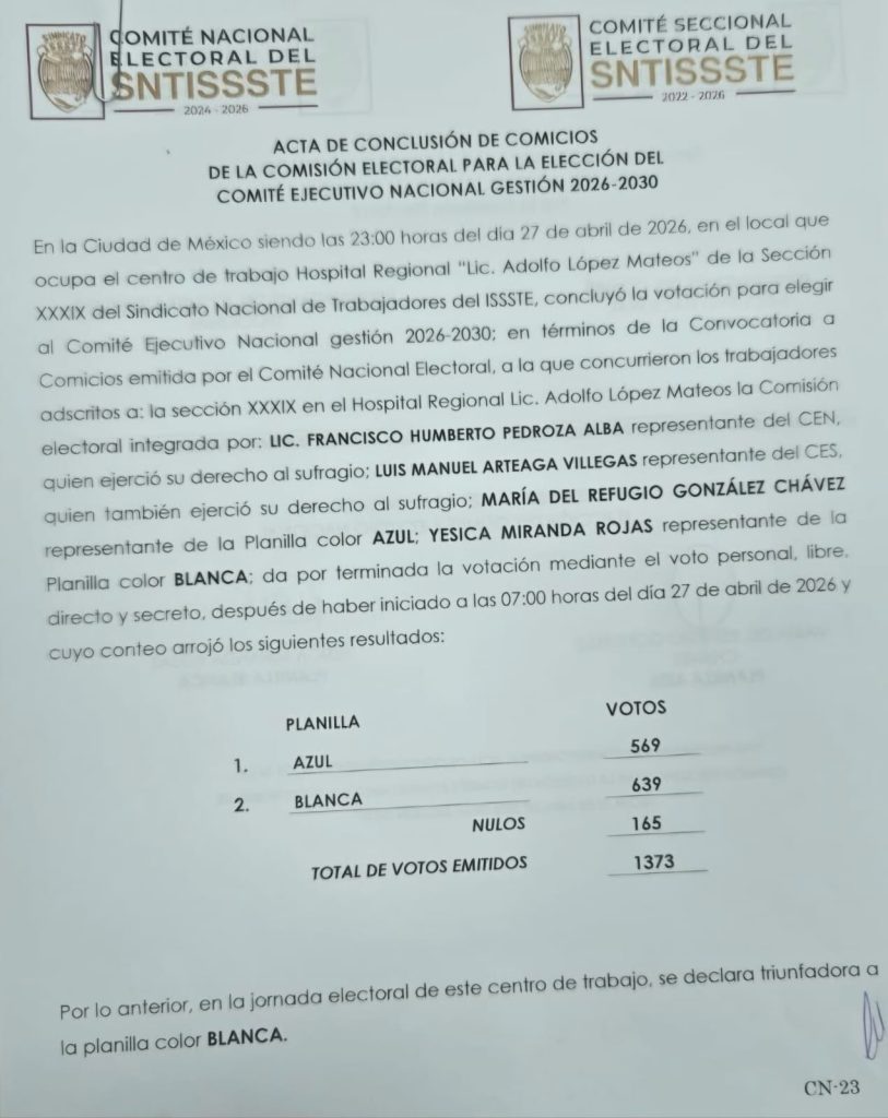En la sección de las oficinas centrales, la planilla azul obtuvo 711 votos por 481 de la blanca, para comité ejecutivo nacional, y 710 y 475 para delegados al congreso de toma de posesión. “Valoramos profundamente la confianza y la disposición que cada uno de ustedes brindó en este proceso”, señaló su dirigencia en un comunicado de agradecimiento a los trabajadores.