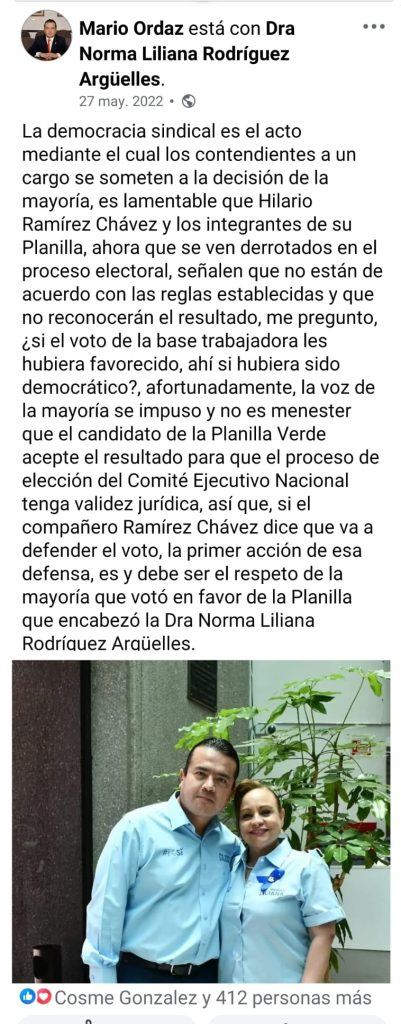 Y puntualizó: “si el compañero Ramírez Chávez dice que a a defender el voto, la primer (sic) acción de esa defensa, es y debe ser el respeto de la mayoría que votó en favor de la Planilla que encabezó la Dra NormaLiliNa Rodríguez Argüelles”.